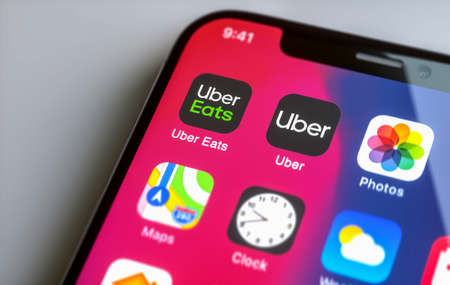Aachen, Germany - January 18 2020: Apple iphone with Uber and Uber Eats App on screen. Uber is an American company offering different transportation services online