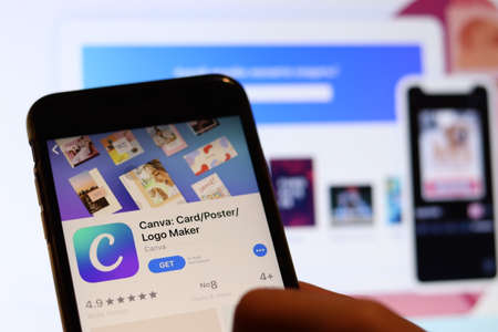 Los Angeles, California, USA - 26 November 2019: Canva icon on phone screen with logo on blurry background, Illustrative Editorial.