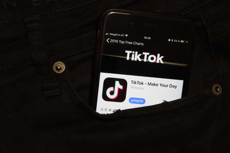 Saint-Petersburg, Russia - 6 December 2019: Mobile phone screen with TikTok icon in pocket close-up, Illustrative Editorial.