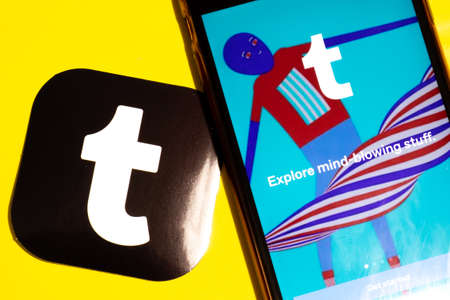 Los Angeles, California, USA - 22 January 2020: tumblr app logo and phone with icon close up on yellow background, Illustrative Editorial