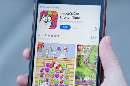 New York, USA - 1 May 2020: Simon Cat Crunch Time app logo close-up on phone screen, Illustrative Editorial.