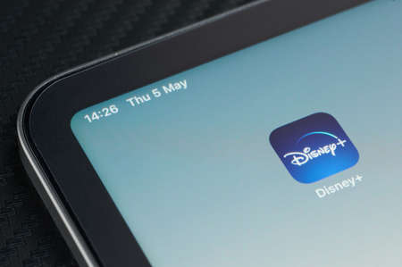 New york, USA - May 5, 2022: Disney plus video streaming app on smartphone screen close up view