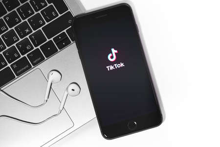 TikTok logo on the display smartphone and notebook closeup. TikTok is app to create and share videos. Moscow, Russia - December 23, 2019
