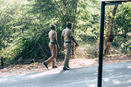 Auroville Tamil Nadu January 24, 2019 View of Indian police officers controling cars at the road to Auroville in southern India in the afternoon