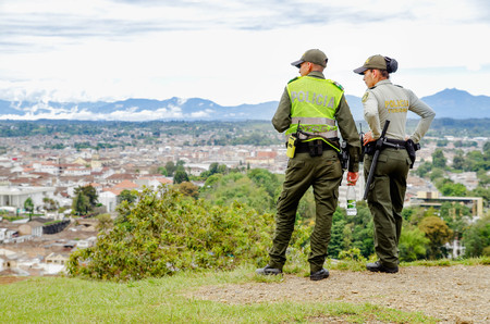 POPAYAN, COLOMBIA - FEBRUARY 06, 2018: Outdoor view of unidentified people wearing uniform police and enjoying the view of the city of Popayan, is the center of the department of Cauca