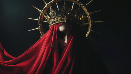 A mysterious, eerie figure draped in a deep red veil, with a face partially obscured by black fabric. The golden crown is adorned with jagged, spiked thorns, giving a regal yet ominous presence. The background is dark, emphasizing the contrast between the rich colors and the haunting expression. The composition evokes themes of gothic mysticism, divine power, and hidden truths.