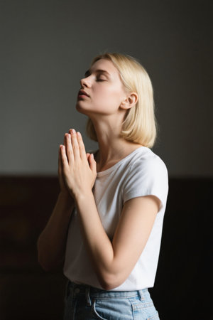 Blonde woman with closed eyes praying