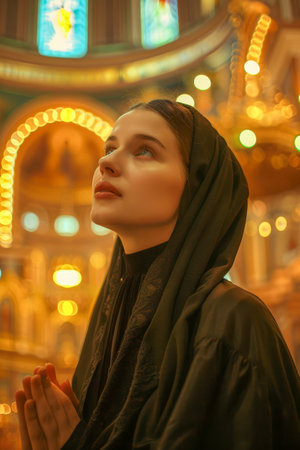 Woman prays in temple. Close-up of praying woman with closed eyes and clasped hands in traditional church. Holy setting emphasizes devotion and inner connection to faith. Concept of Christianity