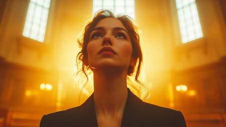 Captivating Portrait of a Woman Looking Upwards in a Grand Hall Illuminated by Warm Golden Light During a Serene Moment Generative AI