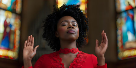 Black woman in red dress raising hand in worship during church service. Concept Worship, Church Service, Red Dress, Black Woman, Faith