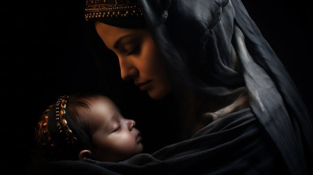 A woman holding a baby in her arms with dark background, AI