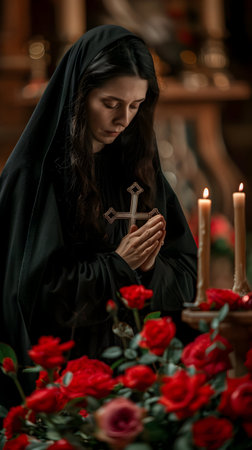 A serene nun in a black habit, deep in prayer inside a church, with hands clasped together.