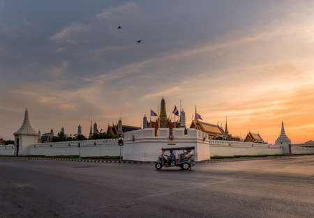 Wat Phra Kaew. During the evening, the road vehicle traffic. The lights are turned on in the evening.