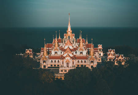 Aerial view Landscape sunset of Wat Sothon Wararam Worawihan, Religious tourist attraction and famous temple in Cha Choeng Sao Province Thailand.