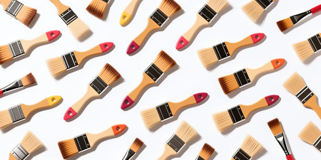 A random pattern featuring multiple paint brushes of varying sizes with wooden handles and colored ends, arranged organically, in a realistic style on a white background.