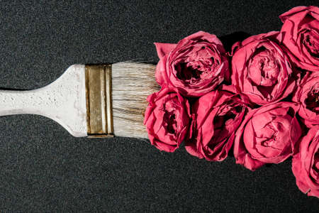 Paint brush drawing with pink flowers on black background. The concept of spring and international womens mothers day. Floral painting and decoration creative. Peonies roses