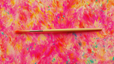 A colorful abstract background featuring a paintbrush resting on a vivid texture of pink, orange, yellow, and red shades, perfect for art-related themes.