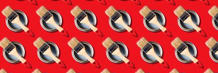 Brush and open paint can pattern on red background. Top view, copy space. Creative design for packaging. Appartment renovation, repair, building and home design concept