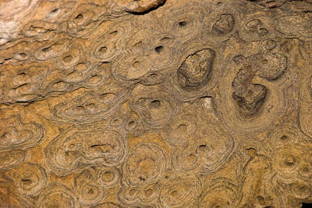 Brown waves on the surface of the stone. Stripped pattern, daylight.
