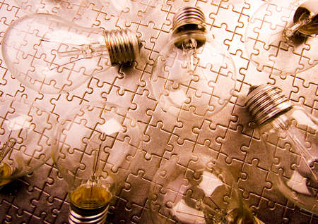 Conceptual image of vision and idea with a pile of white scattered puzzle pieces forming a light bulb on a grey background.
