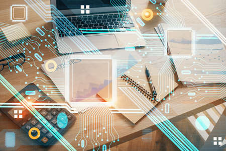Double exposure of technology theme drawing and desktop with coffee and items on table background. Concept of data research.