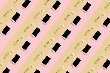 Many smartphones with blank screens and flowers on color background. pattern for design