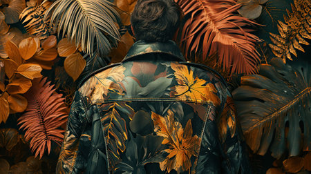 Stylish man in a leather jacket among tropical leaves. Toned image.