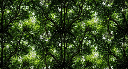 View from below looking up at a dense, green forest canopy with sunlight filtering through.
