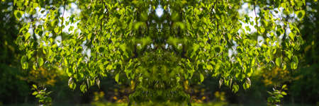 Defocus fresh green tree leaves, frame. Natural background. Closeup beautiful view of nature green leaf on blurred background with copy space. Banner and frame. Soft bright. Texture. Out of focus.