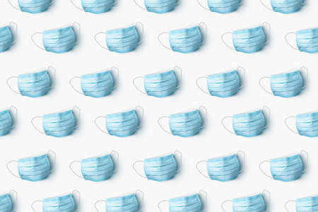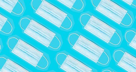 Pattern of face medical masks on blue background. Protection from coronavirus. Top view. Flat lay.