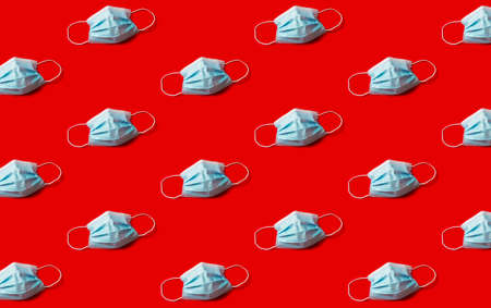 Bizarre medical mask wallpaper concept. Blue disposable virus prevention masks on red background.