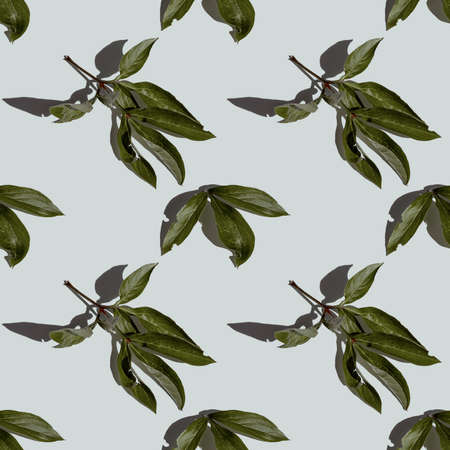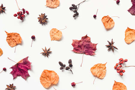 Autumn pattern made of leaves, berries, anise and cones. Flat lay, top view.