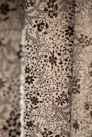 Large rows of pieces of fabric made of cotton, polyester, and other materials in different colors and prints of clothing, soft focus