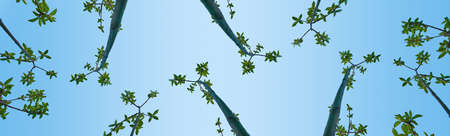 Banner branches of trees with green leaves against the blue sky, view from below.