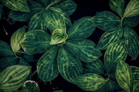 Top view green leaves in the garden. Beauty house plant. Indoor houseplant. Nature abstract background. Above view of dark green leaves with natural pattern. Web banner for organic products.
