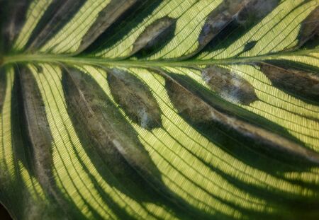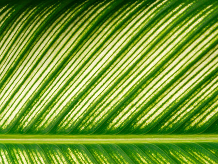 closeup shot showing a green striped Calathea makoyana leaf