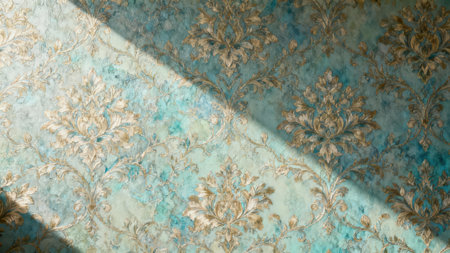 Luxurious texture contrast between bright gold damask motifs and an aged, mottled aqua background, harshly divided by direct window light and a diagonal shadow.