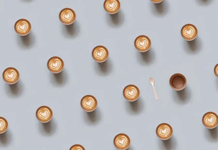 Repeating pattern of Eco-friendly disposable cup with heart shape latte coffee over gray background. top view