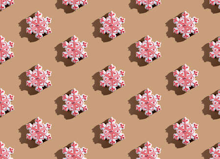 Christmas bakery pattern. Festive decorated cookies. Traditional pastry illustration. Gingerbread star figure biscuits with white icing red ornament isolated on beige pastel.