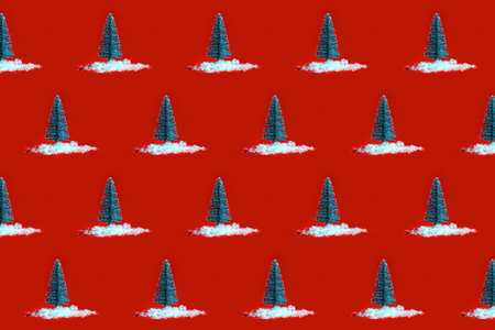 Christmas Pattern made Snowy Christmas Tree with Snow on Red Background. Minimal New Year concept. Flat lay.