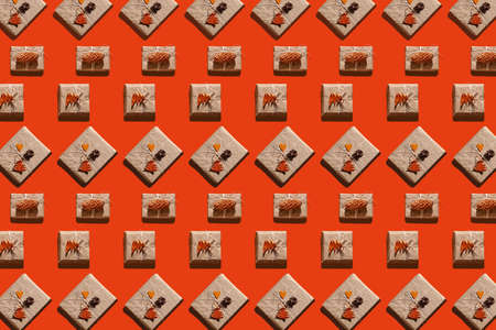 Trendy Christmas pattern made with paper gift boxes photo on pastel orange background. Minimal zero waste New Year concept. Greeting card wallpaper mockup.Winter holiday creative eco friendly backdrop