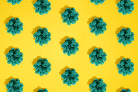 Arranged green cotton flower on a yellow background. Pattern. Flat lay.