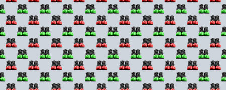 Horizontal banner of seamless pattern of black leather mens shoes in red and green overshoes isolated on white background.