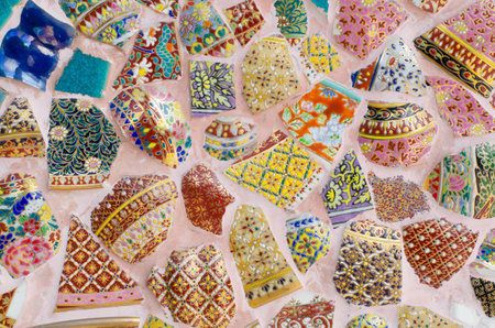 Broken ceramic and ceramic tile decorative on wall and place in temple, mosaic and texture, Thailand