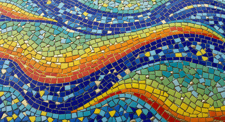 A close-up of a vibrant mosaic tile artwork featuring a colorful,wavy pattern. Small square tiles in shades of blue,green,yellow,orange,and red,with some gold accents,create an abstract representation of waves or flowing lines.