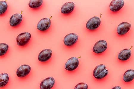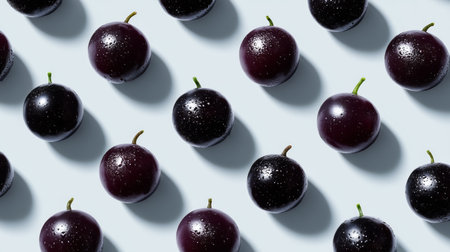 Top view of whole ripe purple plums arranged in a clean repeating pattern on a light surface