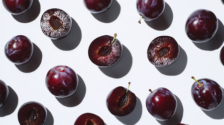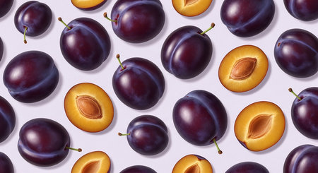 Plums showing plums and sliced plums pattern on light purple background. High resolution image suitable for...