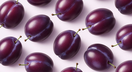 A visually appealing arrangement of fresh plums highlights their rich purple color and glossy texture, illuminated with soft light, perfect for culinary and health themes.