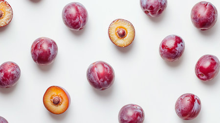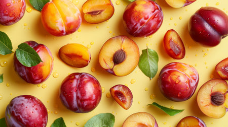 Whole and halved plums on a light yellow background, natural lighting, fresh and colorful,