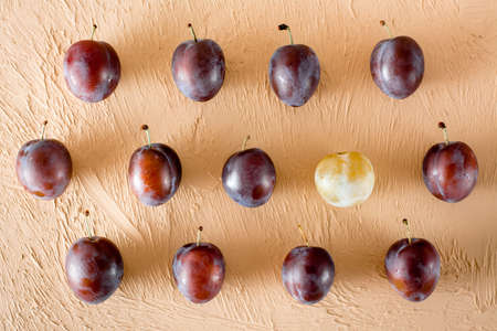 One yellow plum among blue plums on a beige background. Top view. Identity concept.